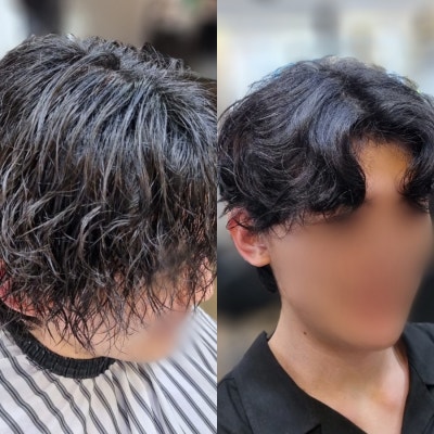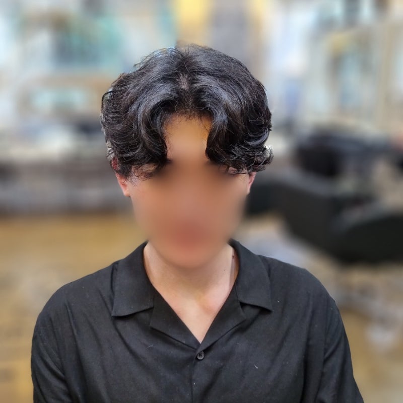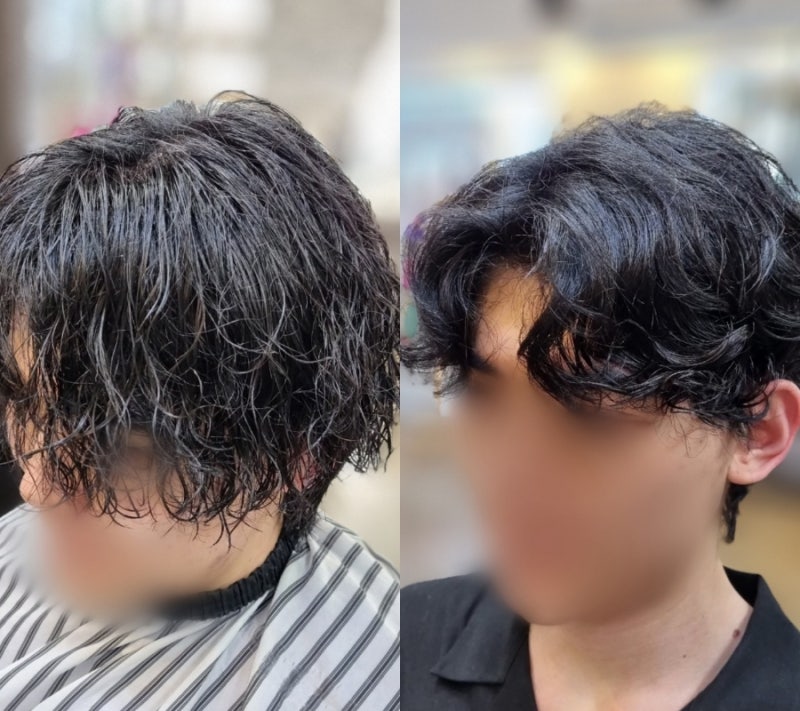 곱슬머리 고객님께서는 5개월 전 머리 자라는 모습을 보고 히피펌을 하셨습니다. 머리를 기르려고 열심히 노력하다 실수로 앞머리가 타서 짧아졌다고 한다.