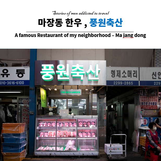 2대째 이어오고 있는 40년 전통의 마장동한우 맛집 풍원축산은 마장동축산시장 서문에서 쭉 직진하면 오른쪽에 위치하고 있습니다. 유독 초록색 간판이 눈에 띄어 쉽게 찾을 수 있어요. 풍원축산 마장동 한우가격