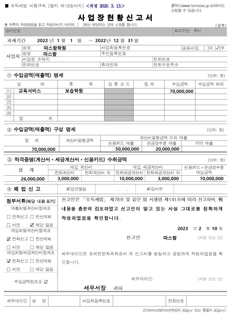 제출서류 – 사업장현황보고서 – 소득금액심사(보)표, 매출(수입업자)별 계산서 합계표, 구매자별 세금계산서 합계표 등 신고가능 – 병원, 의원, 치과, 한의원 등 의료업 진료소 – 학원, 수련원 등 학원 – 농수축산물 도소매 – 주택임대업, 주택신축판매업(국민주택규모) – 대출업 – 재화 또는 용역을 공급하는 모든 사업 면세. 사업현황 보고는 매출액과 상관없이 이루어지며, 보고대상 사업장을 다수 운영하고 있습니다. 그렇다면 각각 신고해야 합니다. 신고기간이 종료된 연도의 소득금액을 신고하므로 12월까지 결산 후 다음해 1월 1일부터 다음해 2월 10일까지 신고하시면 됩니다. 올해는 마감일이 공휴일이므로 13일까지 신고해야 한다.