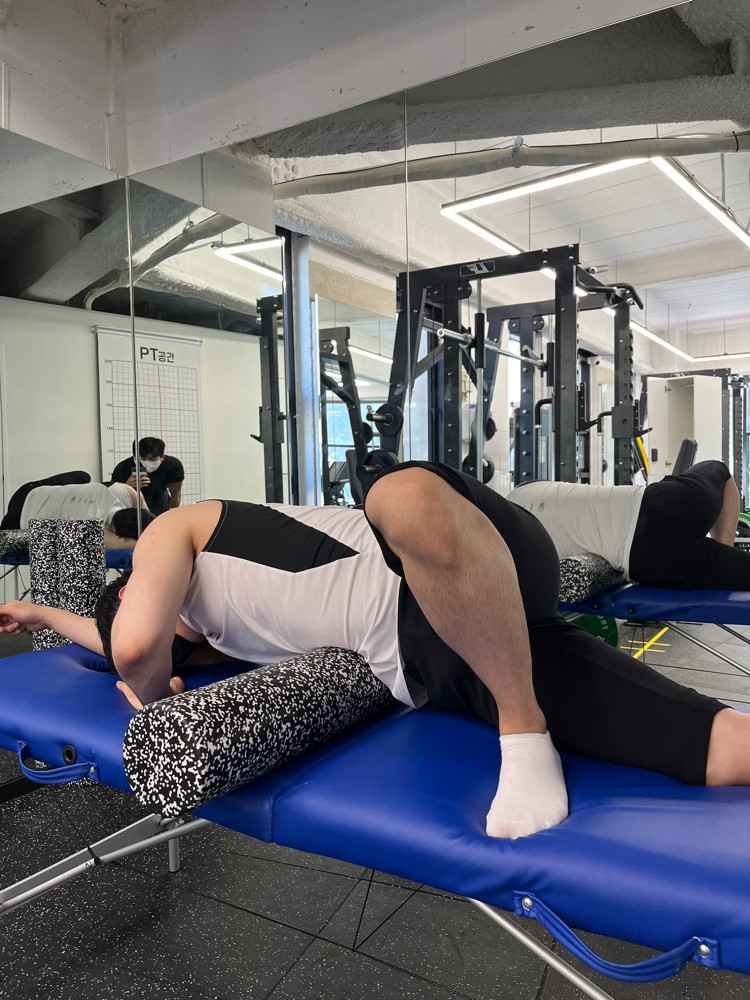 먼저 조개 껍질을 20회씩 2세트 합니다. 중둔근과 고관절을 활성화시키는 동작입니다. 조용하고 필라테스실에서 하기 완전 좋았어요!!! 운동을 마치고 선생님들이 왜 거기 서 있었는지 의아했는데, 알고 보니 사정상 휴게실 앞에 경비를 서고 있었던 것이었습니다. 운동보러 오신줄 알았는데..
