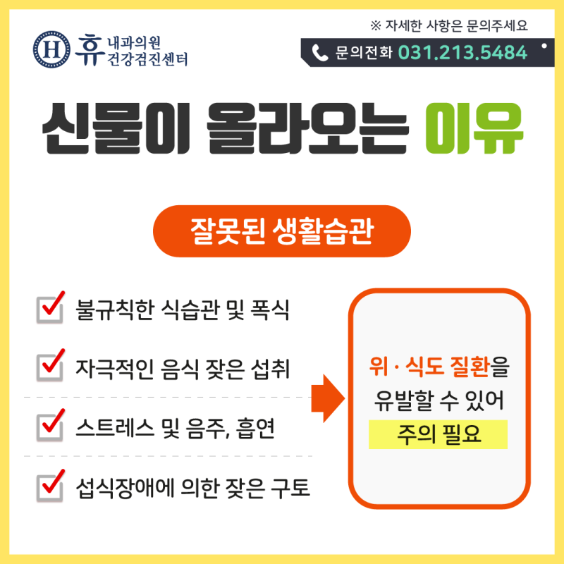 위산이 후두와 식도로 역류하게 되면 신맛이 올라올 때 트림이 잦아질 뿐만 아니라 가슴쓰림, 목과 가슴이 타는 듯한 느낌, 가슴이 답답함, 가슴이 답답함, 가슴이 두근거림, 인후통, 잔기침 등을 일으키게 됩니다. , 마른 기침, 가래를 동반한 쉰 목소리. 목소리, 음식을 삼키기 어려움, 명치의 불편함, 가스, 복부 팽만감 등이 빈번한 위 불편함의 원인입니다.